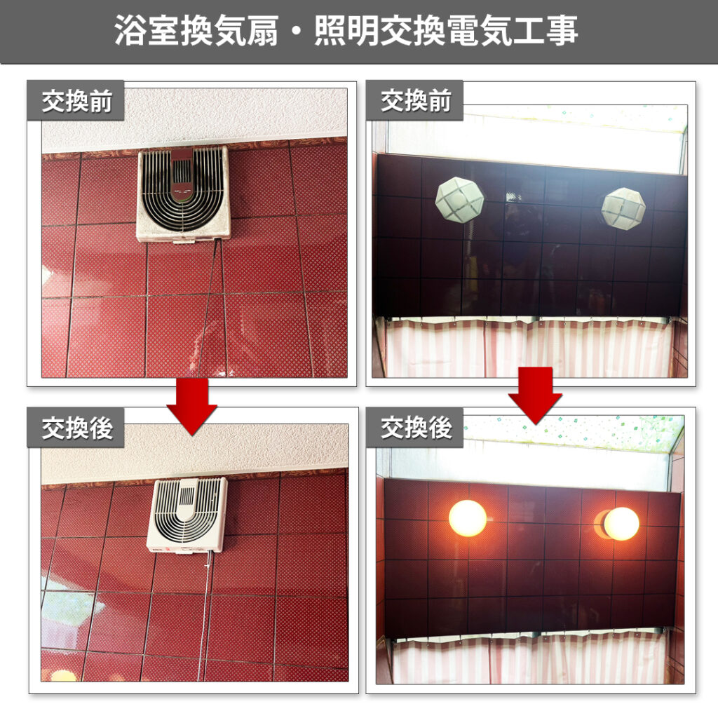 浴室換気扇・照明の交換工事を行いました。長年大切に使われてきた浴室の設備リニューアルの様子をご紹介します。