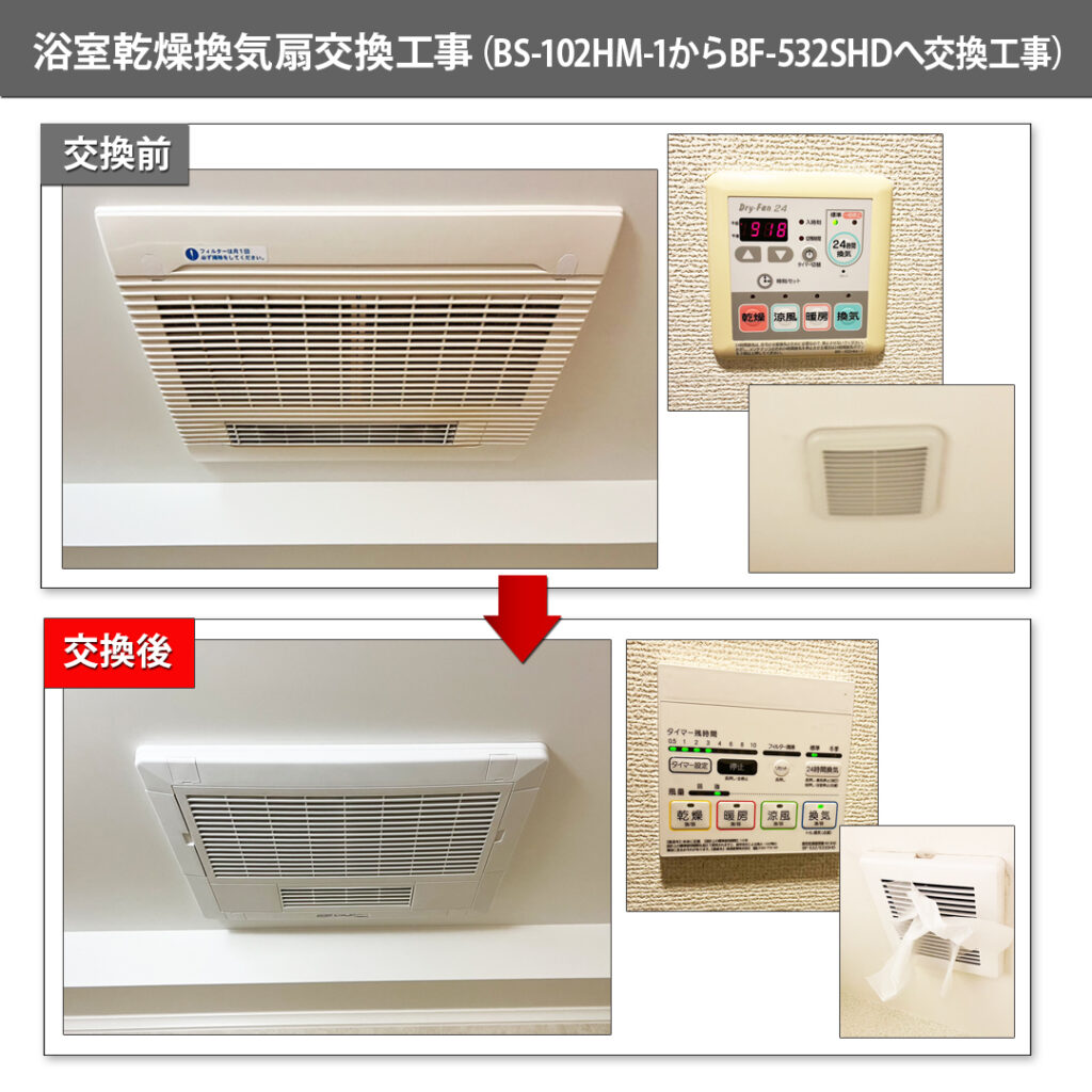 そこで今回、後継機種として高須産業の「BF-532SHD」を選定し、交換作業を実施いたしました。この機種は既存の100V電源と2室換気仕様をそのまま引き継ぐことができ、天井の開口寸法も共通しているため、追加の造作工事を必要とせずにスムーズな設置が可能です。
