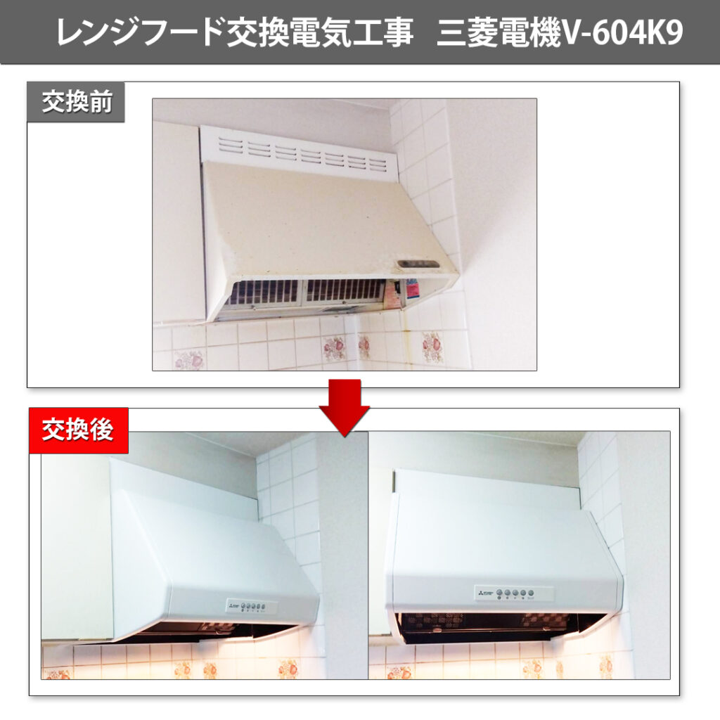 これまで活躍してきた既設のレンジフードは、スイッチを入れると「ゴー」という重い異音が響くようになり、吸い込みの力もかなり弱くなっている状態でした。レンジフードは長期間の使用により、モーターの劣化や油の蓄積が進むと、本来の排気性能が発揮できなくなるだけでなく、故障のリスクも高まってしまいます。今回は修理よりも、今後の安心と使い勝手を考慮し、メンテナンス性に優れた三菱電機製の「V-604K9」へと交換することになりました。